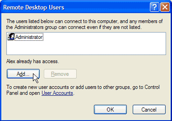 - Haga clic en el botón Agregar y seleccione los usuarios que podrán conectarse de manera remota: